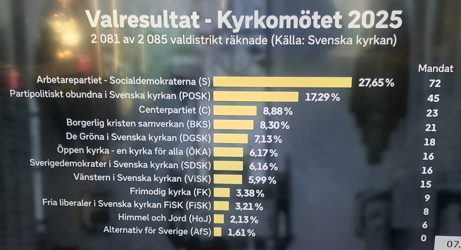 Οι Σοσιαλδημοκράτες αναδείχθηκαν και πάλι πρώτη δύναμη, διατηρώντας περίπου 72 έδρες στο εκκλησιαστικό κοινοβούλιο των 251 μελών. Δεύτερη δύναμη παραμένει η ανεξάρτητη ομάδα POSK (Partipolitiskt obundna i Svenska kyrkan).