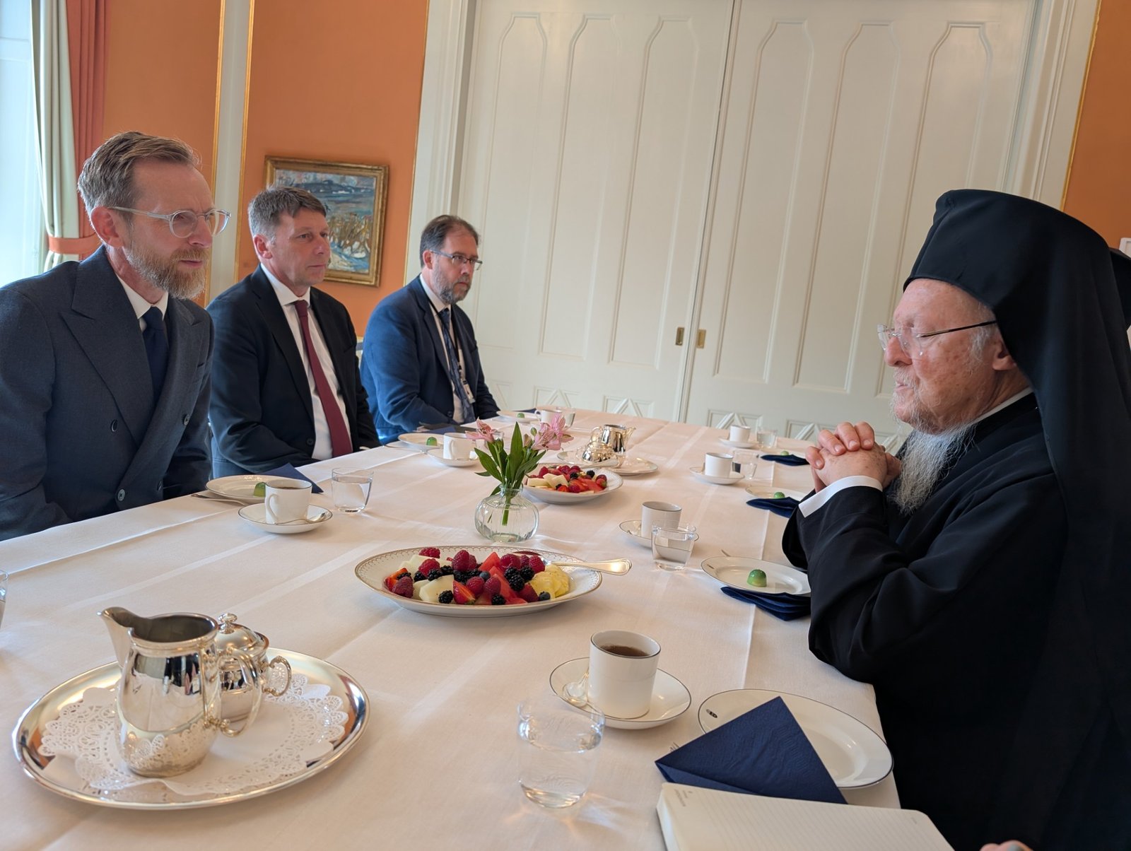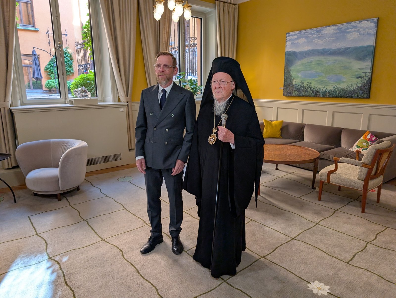 Η Α. Θ. Παναγιότης, ο Οικουμενικός Πατριάρχης κ.κ. Βαρθολομαίος, συνοδευόμενος από τα Μέλη της Συνοδείας του, Σεβ. Μητροπολίτη Νέας Ιερσέης κ. Απόστολο, Πανοσιολ. Μ. Εκκλησιάρχη κ. Αέτιο, και τον Πανοσιολ. Διάκονο κ. Επιφάνιο και τον οικείο Μητροπολίτη Σουηδίας και πάσης Σκανδιναυΐας, Σεβ. κ. Κλεόπα, και εκκίνησε την δευτέρα ημέρα της υψηλής Αυτού επισκέψεως στην Στοκχόλμη, επισκεφθείς την πρωΐα της 22 Αυγούστου 2025, τον Εξοχώτατο Υπουργό κ. Jakob Forssmed, αρμόδιο για τις θρησκευτικές κοινότητες στην Σουηδία, μετά του οποίου είχε ωριαία συζήτηση.