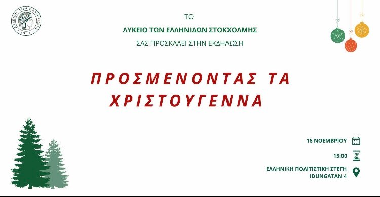 Το Λύκειο Ελληνίδων Στοκχόλμης προσκαλεί όποιον ενδιαφέρεται στην εκδήλωση που θα πραγματοποιηθεί στην Πολιτιστική Στέγη, Idungatan 4, στις 16.11.2024 στις 15.00, με τίτλο «Προσμένοντας τα Χριστούγεννα».