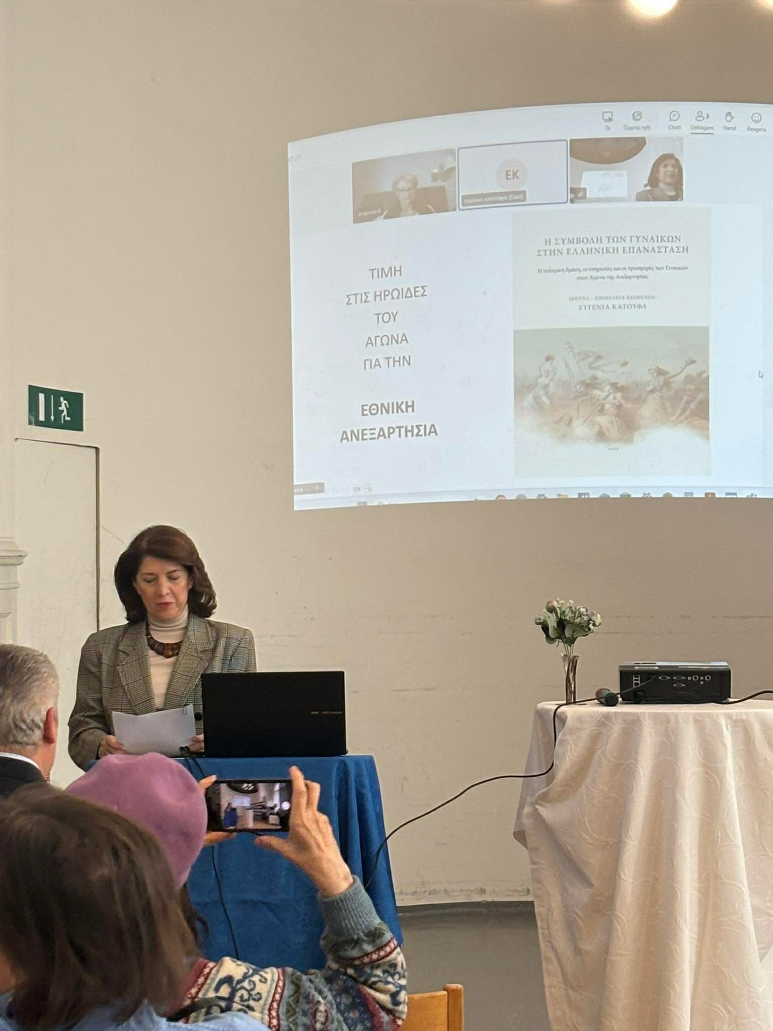 Το πρόγραμμα συνεχίστηκε με την ιδιαίτερα ουσιαστική και εμπεριστατωμένη παρουσίαση της κ. Ευγενίας Κατούφα, δημοσιογράφου και ιστορικής ερευνήτριας, με αφορμή το βιβλίο της «Η Συμβολή των Γυναικών στην Ελληνική Επανάσταση», έργο που έχει διακριθεί με Εύφημο Μνεία από την Ακαδημία Αθηνών. Μέσα από την ομιλία της αναδείχθηκε ο καθοριστικός ρόλος της Ελληνίδας στον Αγώνα του 1821, μέσα από τεκμηριωμένη ιστορική έρευνα και ζωντανή αφήγηση.