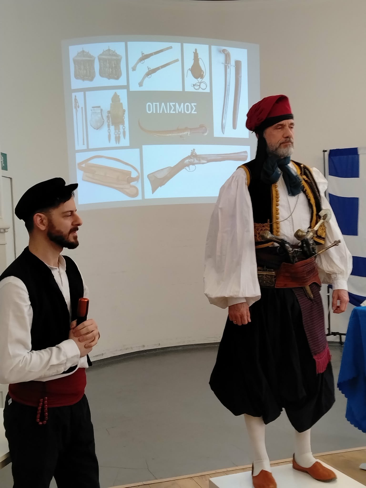 Ακολούθησε μια εντυπωσιακή και διαδραστική παρουσίαση του κ. Αλεξίου Φραγκούλη, σχετικά με την υδραίικη ανδρική ενδυμασία και τον οπλισμό της επαναστατικής περιόδου, βασισμένη σε προσωπική συλλογή. Με τη συμμετοχή του κ. Γεωργίου Γεωργαλά και την ενεργή εμπλοκή του κοινού, η αναπαράσταση απέκτησε ζωντάνια και εκπαιδευτικό χαρακτήρα.