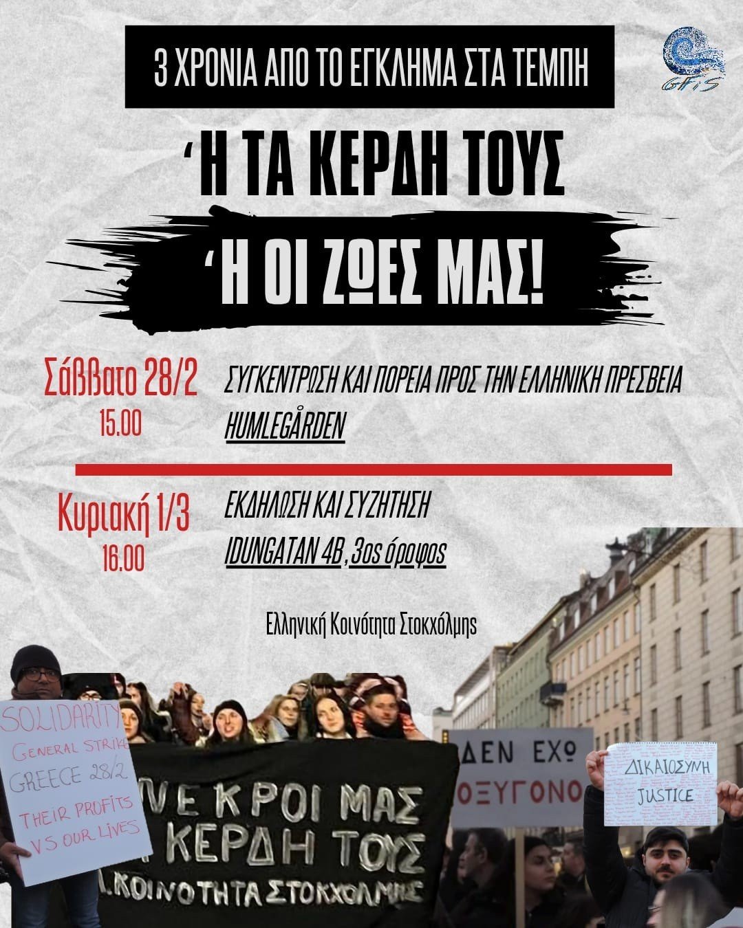 Η Ελληνική Κοινότητα Στοκχόλμης καλεί όλους και όλες να συμμετάσχουν σε δύο σημαντικές εκδηλώσεις μνήμης και διεκδίκησης: το Σάββατο 28 Φεβρουαρίου, στις 15:00, θα πραγματοποιηθεί συγκέντρωση και πορεία από το Humlegården προς την Ελληνική Πρεσβεία στη Στοκχόλμη, για να ακουστεί δυνατά η φωνή της κοινωνίας ενάντια στην ατιμωρησία. Την Κυριακή 1 Μαρτίου, στις 16:00, θα ακολουθήσει εκδήλωση και συζήτηση στον 3ο όροφο, Idungatan 4B, με στόχο την ενημέρωση και τη συλλογική επεξεργασία των γεγονότων, καθώς και τη στήριξη των οικογενειών των θυμάτων.
