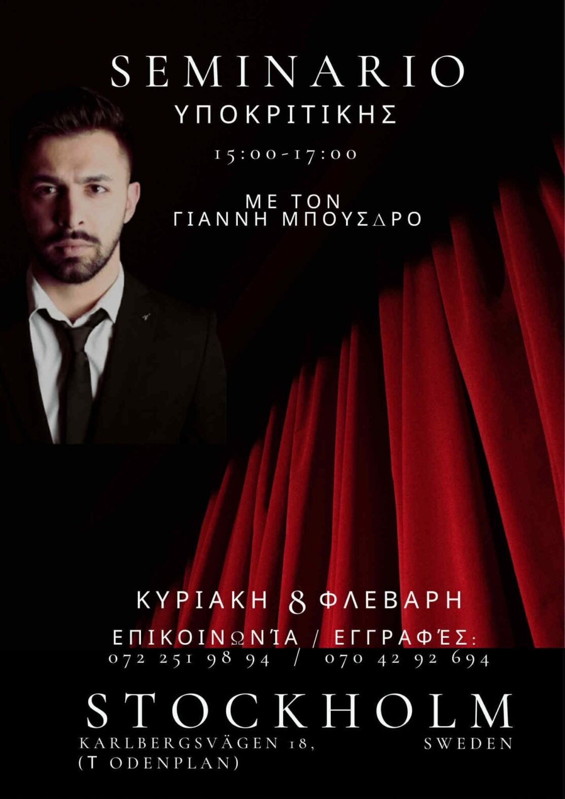 Ο Ελληνικός Λαογραφικός Σύλλογος Σουηδίας ανοίγει την αυλαία σε ένα νέο καλλιτεχνικό εγχείρημα και σας προσκαλεί στην έναρξη μιας σειράς σεμιναρίων υποκριτικής, με εισηγητή τον καταξιωμένο ηθοποιό Γιάννη Μπούσδρο.
